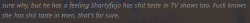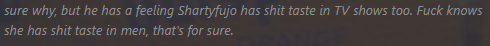 Hell yeah she is posting how she likes hairy men again. Chinnypedos, when Shartyfujo speaks we shut up and listen.